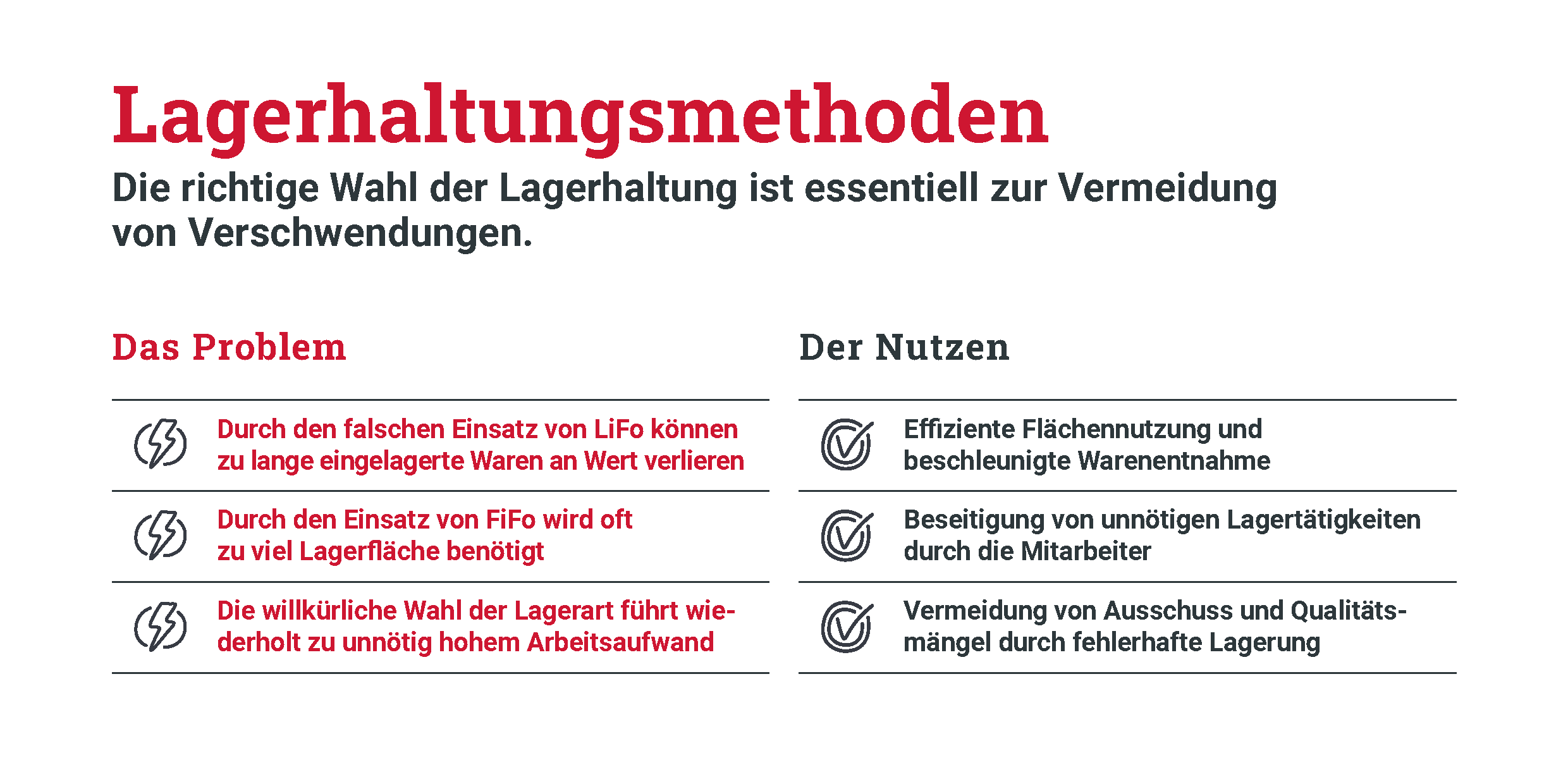 Die richtige Lagerhaltungsmethode bringt viele Vorteile mit sich. Sie trägt zur Kostenreduktion bei, indem Überbestände vermieden und Lagerflächen effizient genutzt werden.