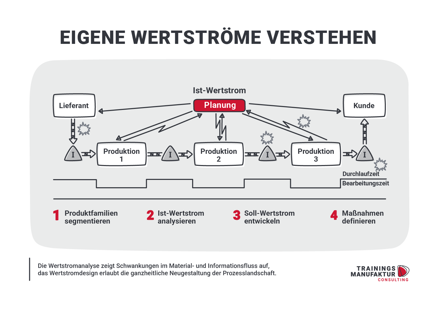 Für jeden Schritt berechnet man dann die typische Leistungskennzahlen. Hierzu können z.B. gehören: Taktzeit, Losgrößen, Lagerreichweiten, Durchlaufzeiten, Anzahl an Anlagenbediener, Ausschussraten oder Rüstzeiten, um nur einige zu nennen. Die Informationen werden auf einem Blatt Papier aufgetragen und sukzessive um weitere Informationen ergänzt. Hierzu zählen auch Angaben zum Informationsfluss. Wann werden welche Aufträge wie in die Produktion gegeben? Wie funktioniert die Koordination zwischen den einzelnen Prozessstufen? Das Ergebnis ist eine Darstellung der Ist-Situation. An dieser lassen sich Engpässe ideal aufdecken. Anschließend werden Optimierungspotentiale erarbeitet. Hierbei finden vor allem Werkzeuge aus dem Lean Management Baukasten ihre Anwendung. Auf Basis dieser Potentiale wird dann der neue Wertstrom konzipiert (Re-Design). Das Ergebnis ist ein Soll-Wertstrom, der die Basis für die Umsetzung der entdeckten Potentiale bildet.