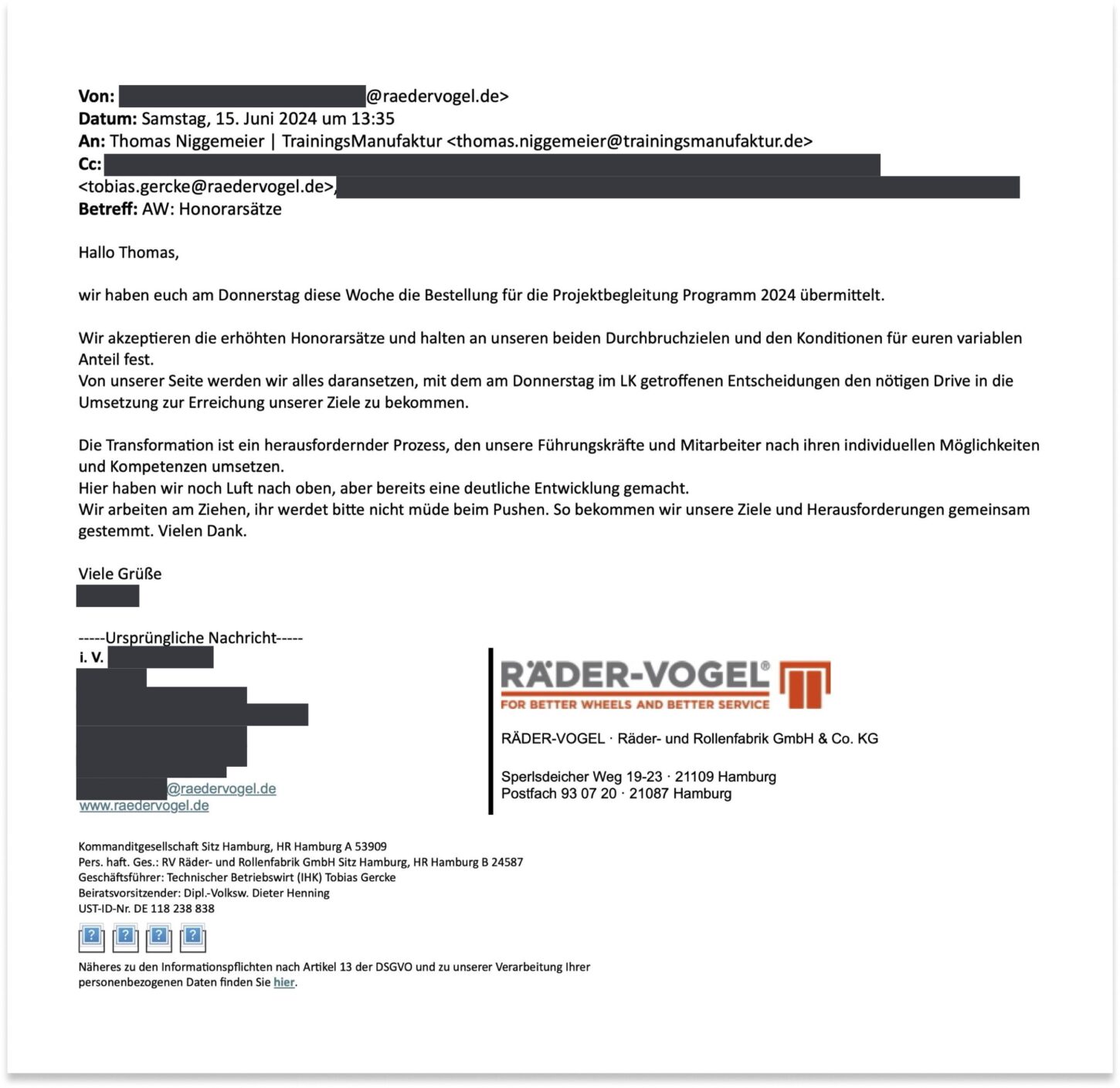 Eine tragende Führungskraft von RÄDER-VOGEL bekräftigte diesen Willen in Vertretung des Unternehmens in einer E-Mail vom 15. Juni 2024 unmissverständlich: