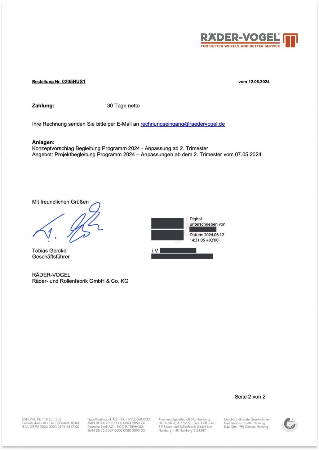 Im Vertrauen auf diese klare Zusage und um die notwendige Umsetzung und intensive Unterstützung von RÄDER-VOGEL sicherzustellen, haben wir andere Projektanfragen verschoben oder abgesagt. Wir bestätigten die Annahme des Auftrags am 01. Juli 2024.